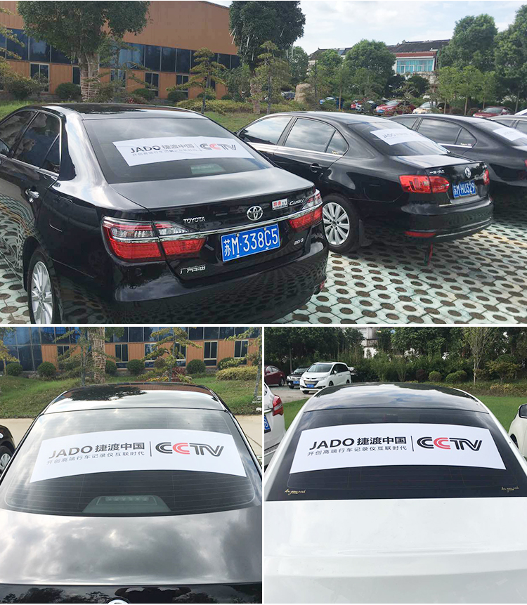 活動開始前,在揚州天泓汽車貿易有限公司所有工作人員的密切配合下,近110輛私家車的后擋風玻璃貼上了“JADO捷渡中國|CCTV”鮮明字樣的單透,并與車主達成共識:文明駕乘,注意行車安全。