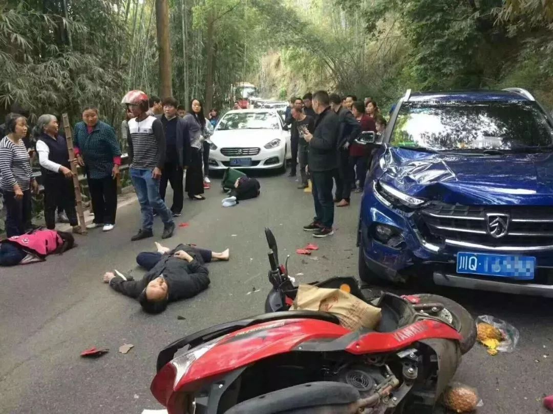 據視頻上的行車記錄儀顯示,事發路段車流量較大,路面平坦但彎道較多。畫面中一輛搭載三人的兩輪摩托車行駛在安裝有行車記錄儀的汽車前方。當摩托車行駛至一塊寫有“三中隊”的交通指示牌下, 對面一輛藍色寶駿汽車(車牌川Q169**)突然越過中間線超車,與摩托車發生猛烈撞擊,摩托車上三名駕乘人員當即飛出,摔在公路上。