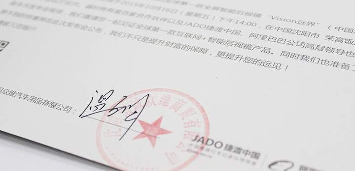 2015年10月16日,以 “改變成就未來” 為主題的“JADO捷渡中國智能后視鏡遠(yuǎn)界系列(中國.遼寧)發(fā)布會暨戰(zhàn)略合作簽約儀式”,在中國沈陽榮富大酒店完美落幕。